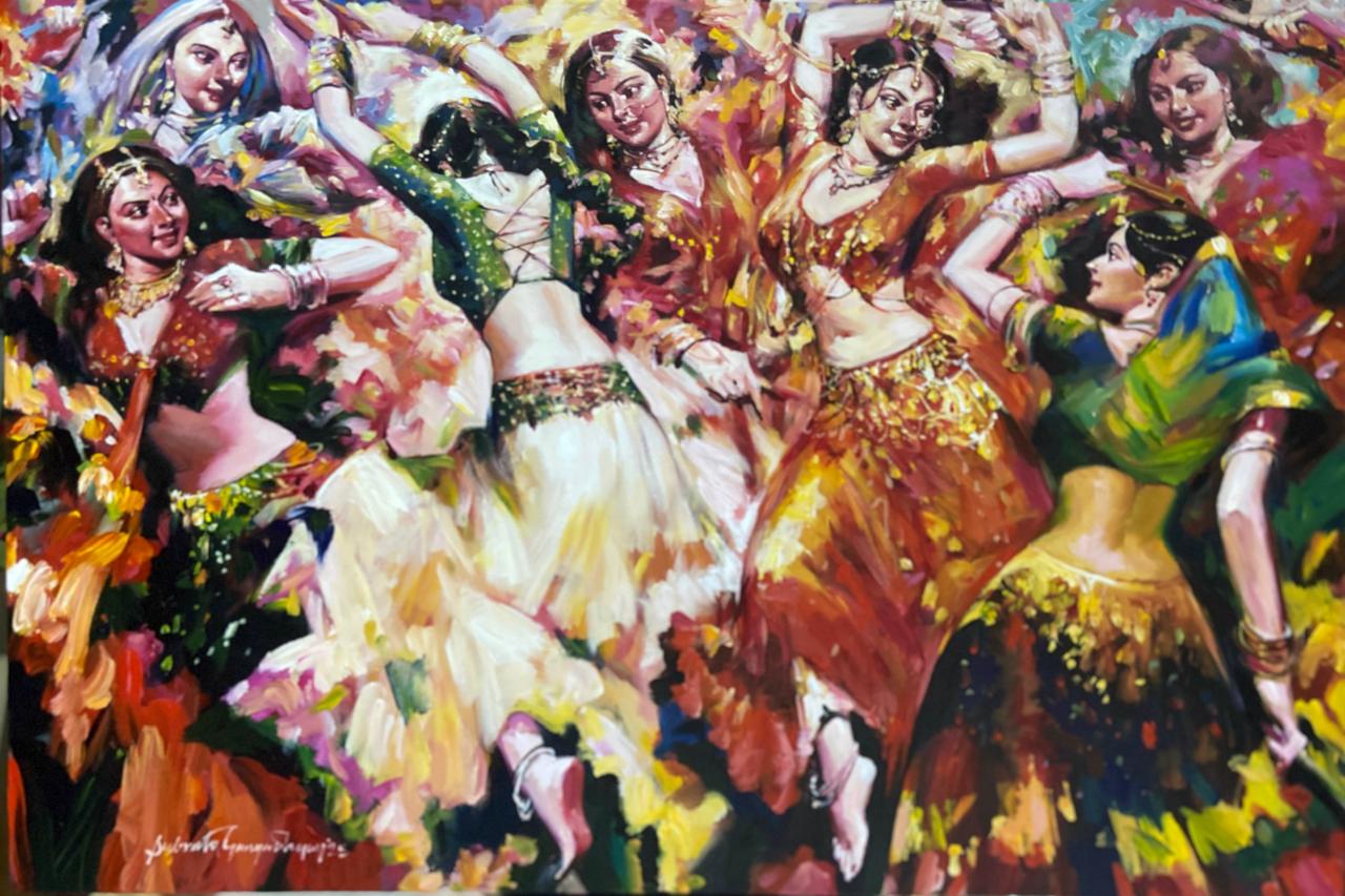 He is best known for his celebrated “Rhythmic Harmony Series,” where dancers in vibrant oils and acrylics appear in dynamic motion, their swirling costumes capturing rhythm, grace, and movement. This iconic series has become a defining hallmark of his artistic identity.