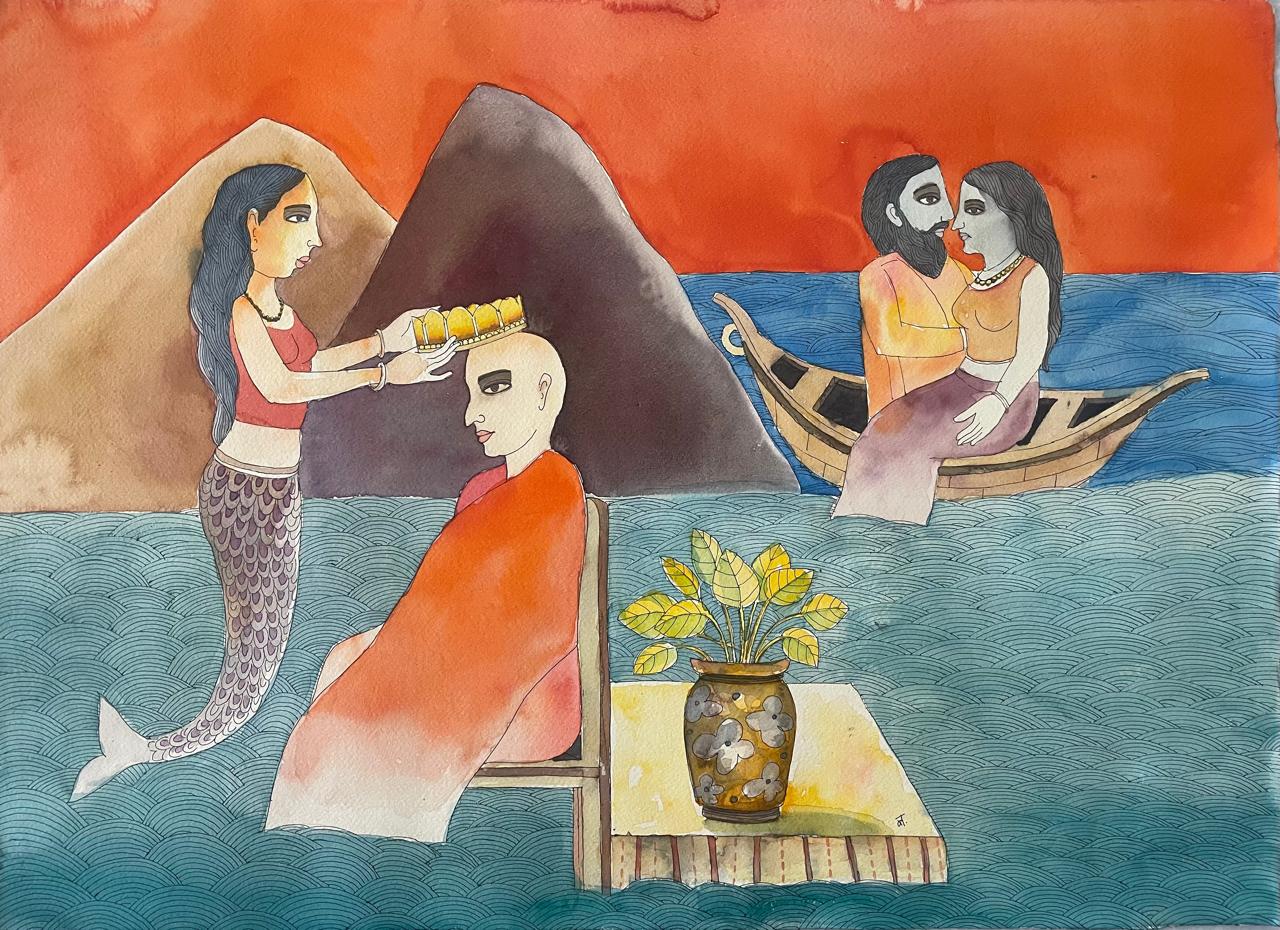 Influenced by the intricate beauty of Indian miniature painting, Narayan favored the intimacy of smaller formats, working mostly with watercolours. His delicate lines and gentle compositions revealed a belief in the two-dimensional nature of painting, while his explorations with etchings, woodcuts, ceramics, and children’s book illustrations spoke to his restless creativity.